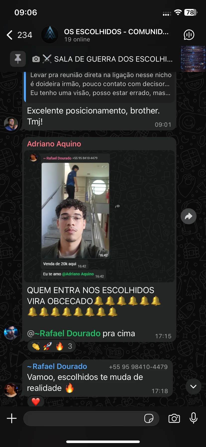 Grupo exclusivo no WhatsApp com profissionais de vendas trocando experiências e resultados diariamente.